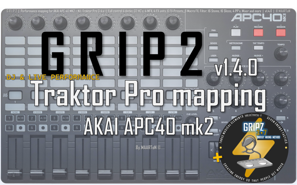 - The GRIP2 v1.4.0 MAPPING: ultra fast workflow and unmatched operability, mapped for your Akai APC40 Mk2 controller to perform as DJ or live with Traktor Pro;